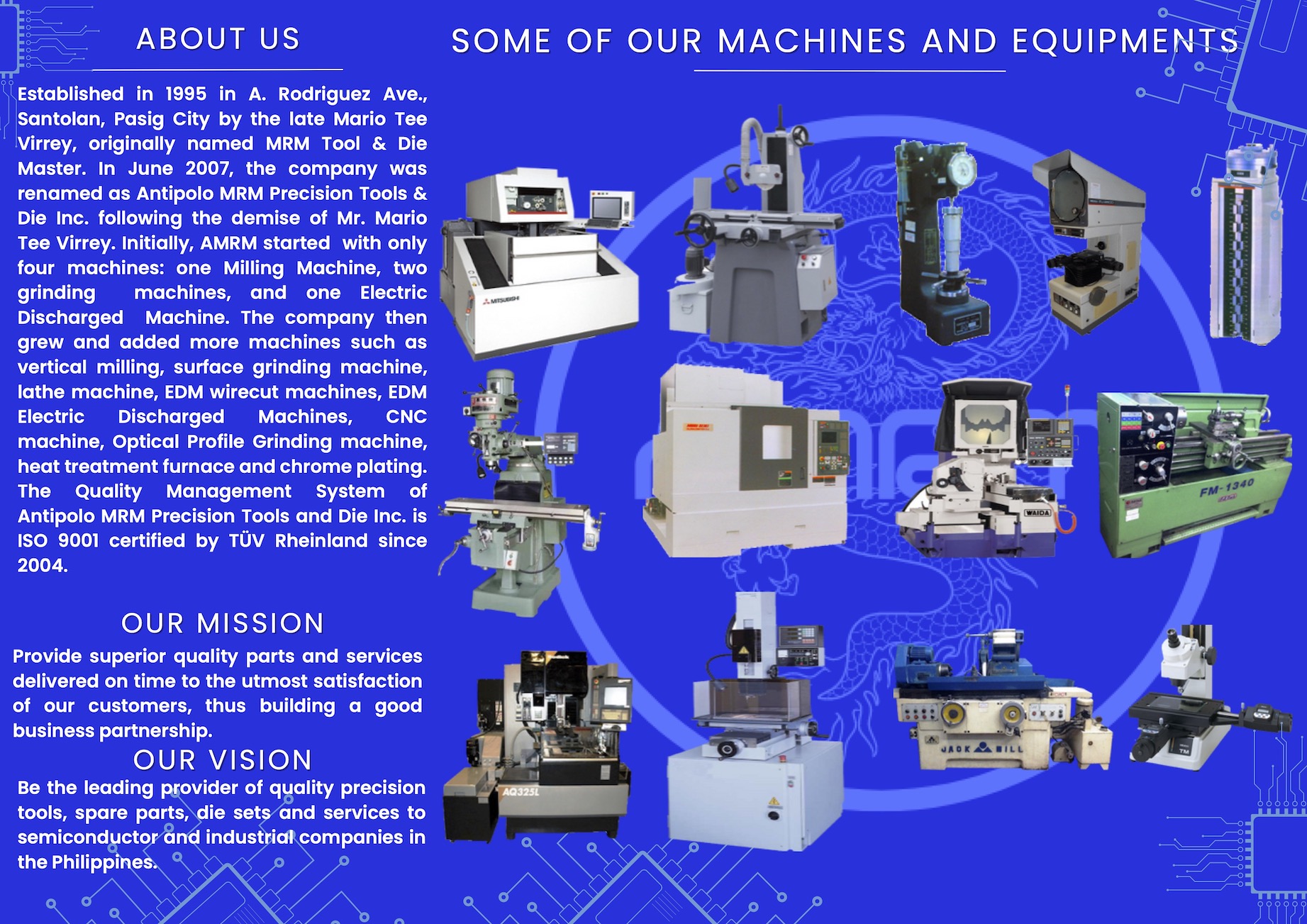 Established by the late Mr. Mario Tee Virrey in Pasig City in 1995, previously named MRM TOOL & DIE MASTER In 2002, the company transferred to Antipolo City. The company was renamed to ANTIPOLO MRM PRECISION TOOLS & DIE INC. on June 9, 2007 which it became a corporation as well. AMRM has been ISO 9001 certified by TUV Rheinland since 2004 which the company has maintained. The company specializes in the supply of Precision Machine Parts for Semiconductor and Industrial application.